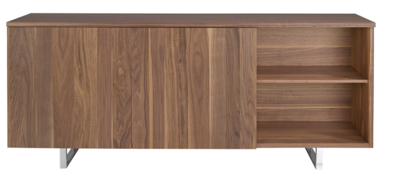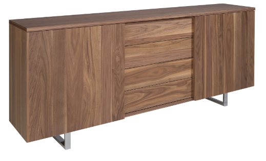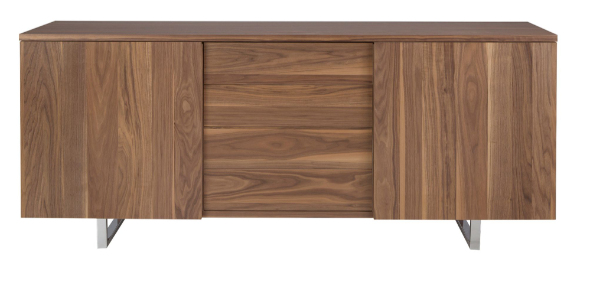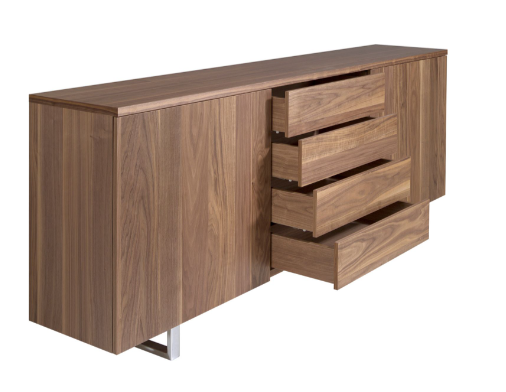 Aparador de diseño moderno con estructura de madera chapada en nogal natural y unas originales patas de acero inoxidable cromado. Cuenta con un amplio espacio de almacenaje con 4 cajones con sistema de apertura push and pull y cierre soft-closing, y 2 puertas con sistema de apertura y cierre corredera. 210 x 42 x 90 cm.