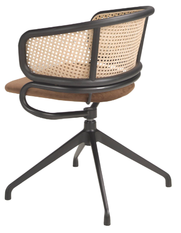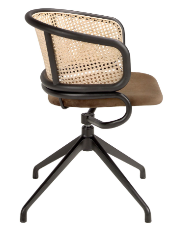 Silla giratoria con reposabrazos de diseño moderno con asiento tapizado en tela aterciopelada color marrón y respaldo de rattán. 56 x 53 x 74 cm.
