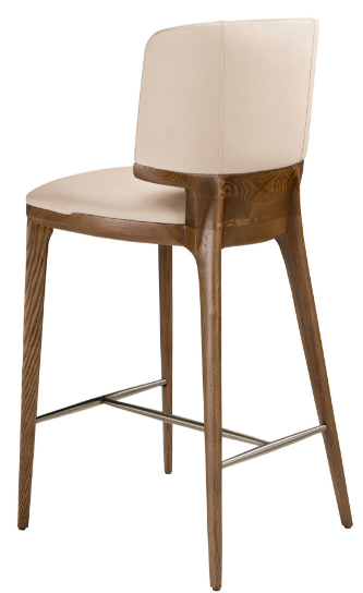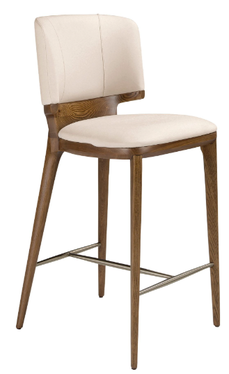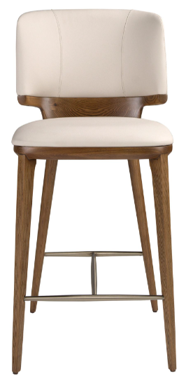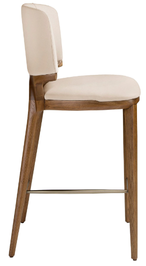 Taburete de diseño moderno con asiento y respaldo tapizados en polipiel color crema. Tanto por su detalle en acero inoxidable en color dorado, como por sus patas de madera en color nogal de estilo vanguardista a la vez que atemporal.  51 x 55 x 75 cm.